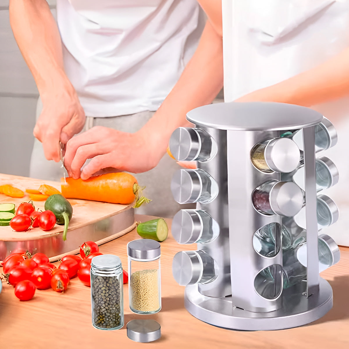Los frascos de vidrio permiten identificar fácilmente su contenido, mientras que las tapas de acero aseguran un cierre hermético para conservar la frescura de las especias por más tiempo. El estante, resistente y duradero, facilita el acceso rápido a tus ingredientes favoritos al momento de cocinar.