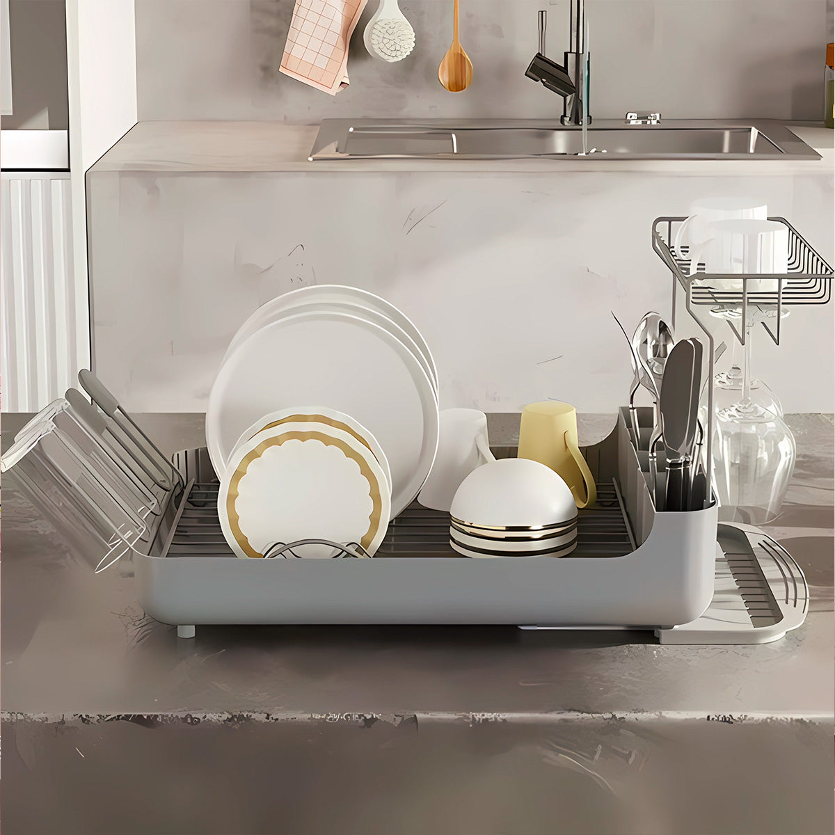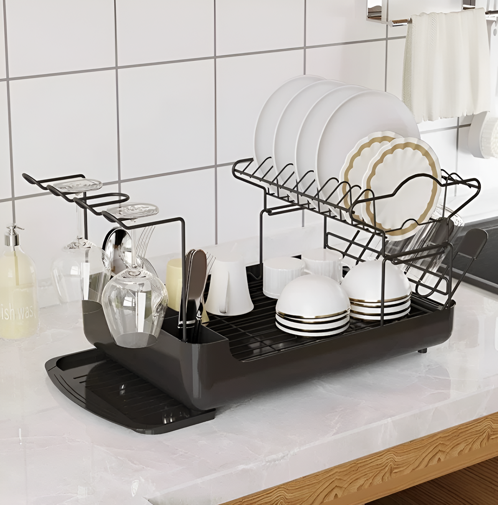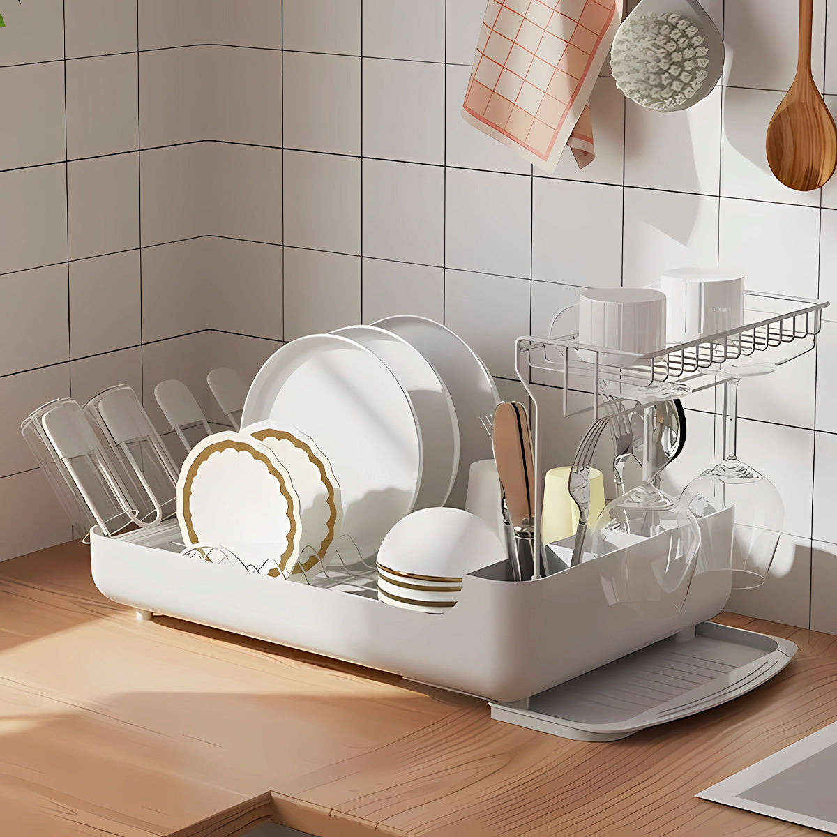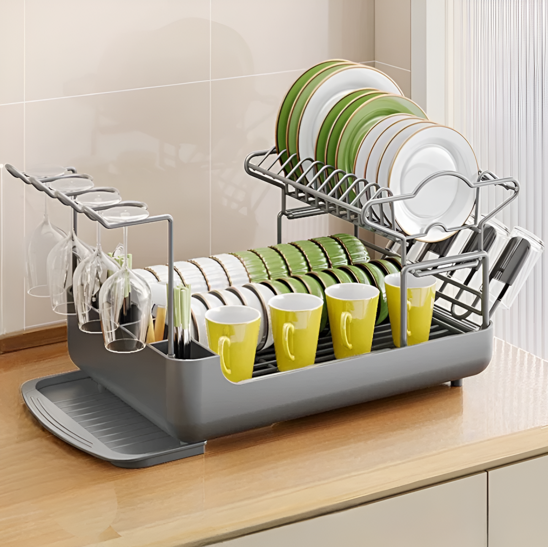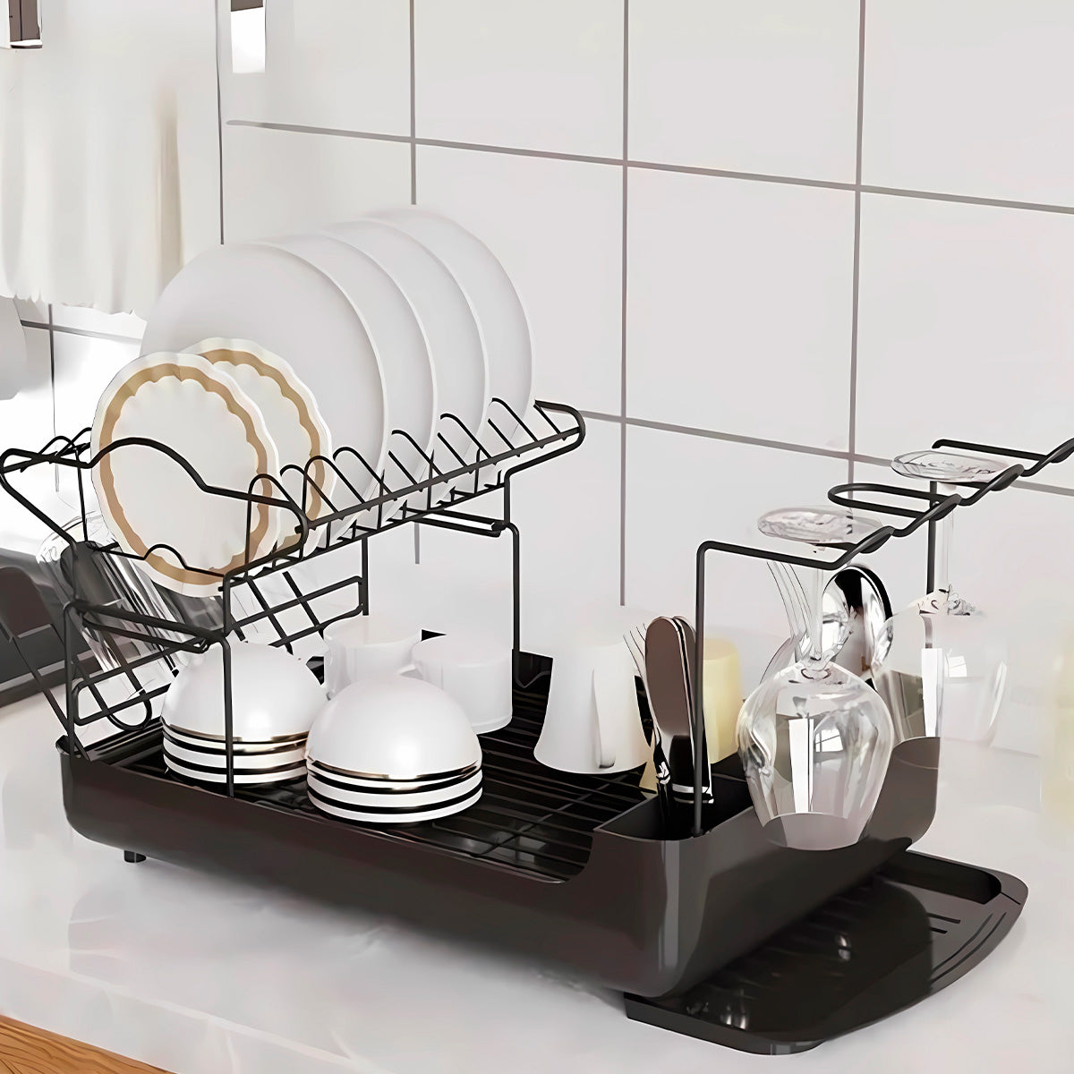 Recupera tu valioso espacio en la encimera con este práctico escurreplatos de 2 niveles, diseñado para ofrecer el doble de capacidad sin sacrificar comodidad. Su estructura vertical maximiza el almacenamiento, permitiéndote organizar más vajilla en menos espacio.