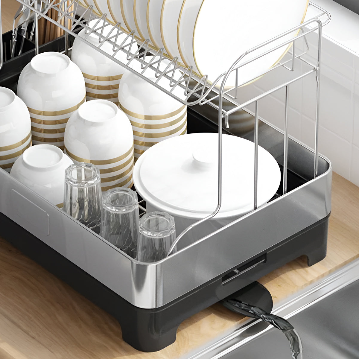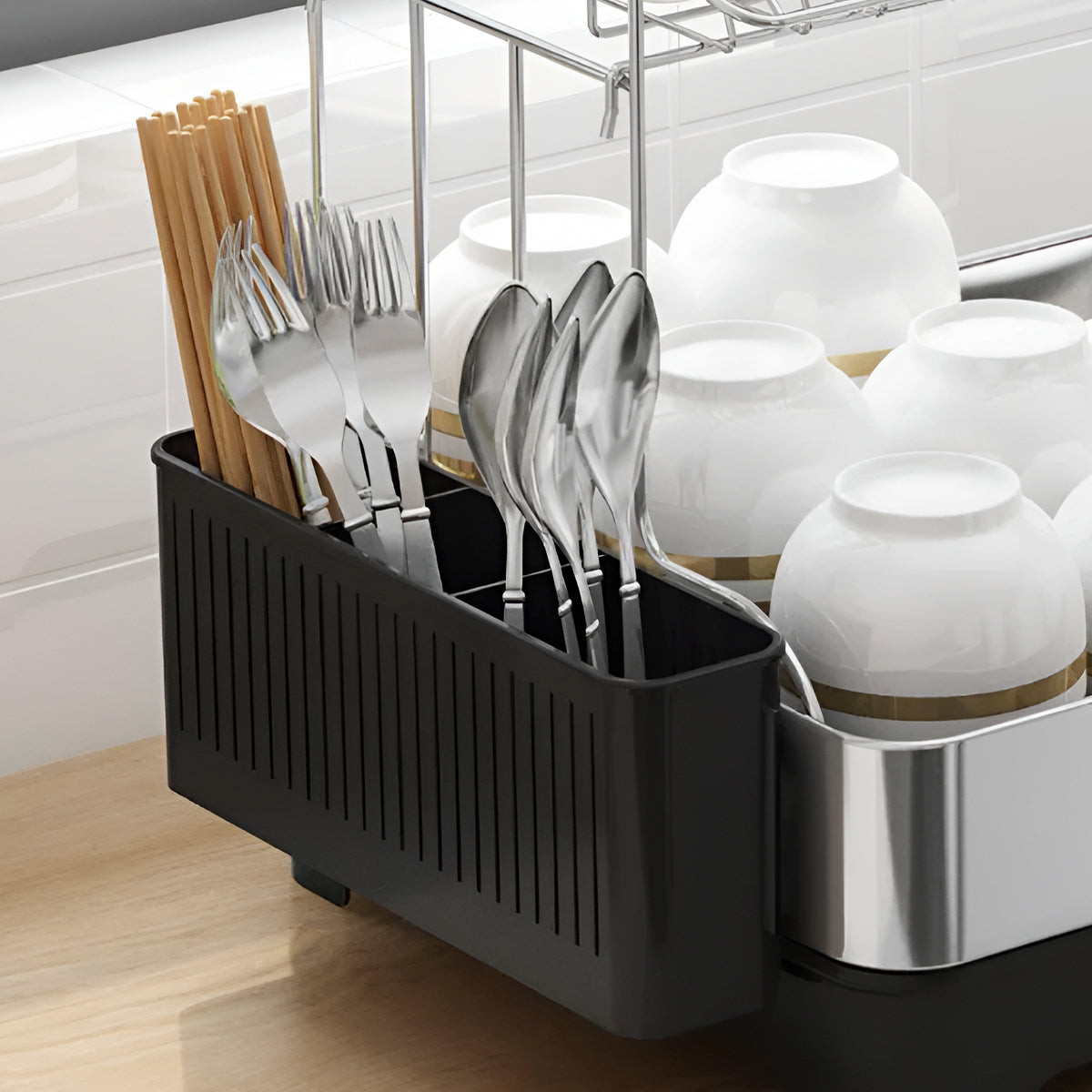Incluye un compartimento lateral especial para cubiertos y utensilios, así como una bandeja de drenaje inferior delgada que canaliza el agua directamente al lavadero, evitando acumulaciones y manteniendo la encimera seca. Ideal para cocinas prácticas, este escurridor combina funcionalidad y estilo en un solo producto.