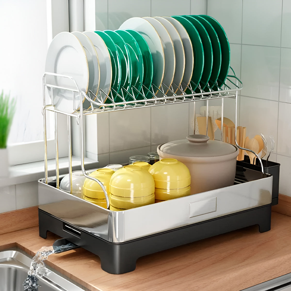 Optimiza el orden y la limpieza de tu cocina con este práctico escurridor de platos de dos niveles. Su estructura resistente permite organizar platos, tazas y otros utensilios con total comodidad. El diseño elevado facilita el secado al aire libre, mientras que su acabado cromado le da un toque moderno y elegante a cualquier espacio.
