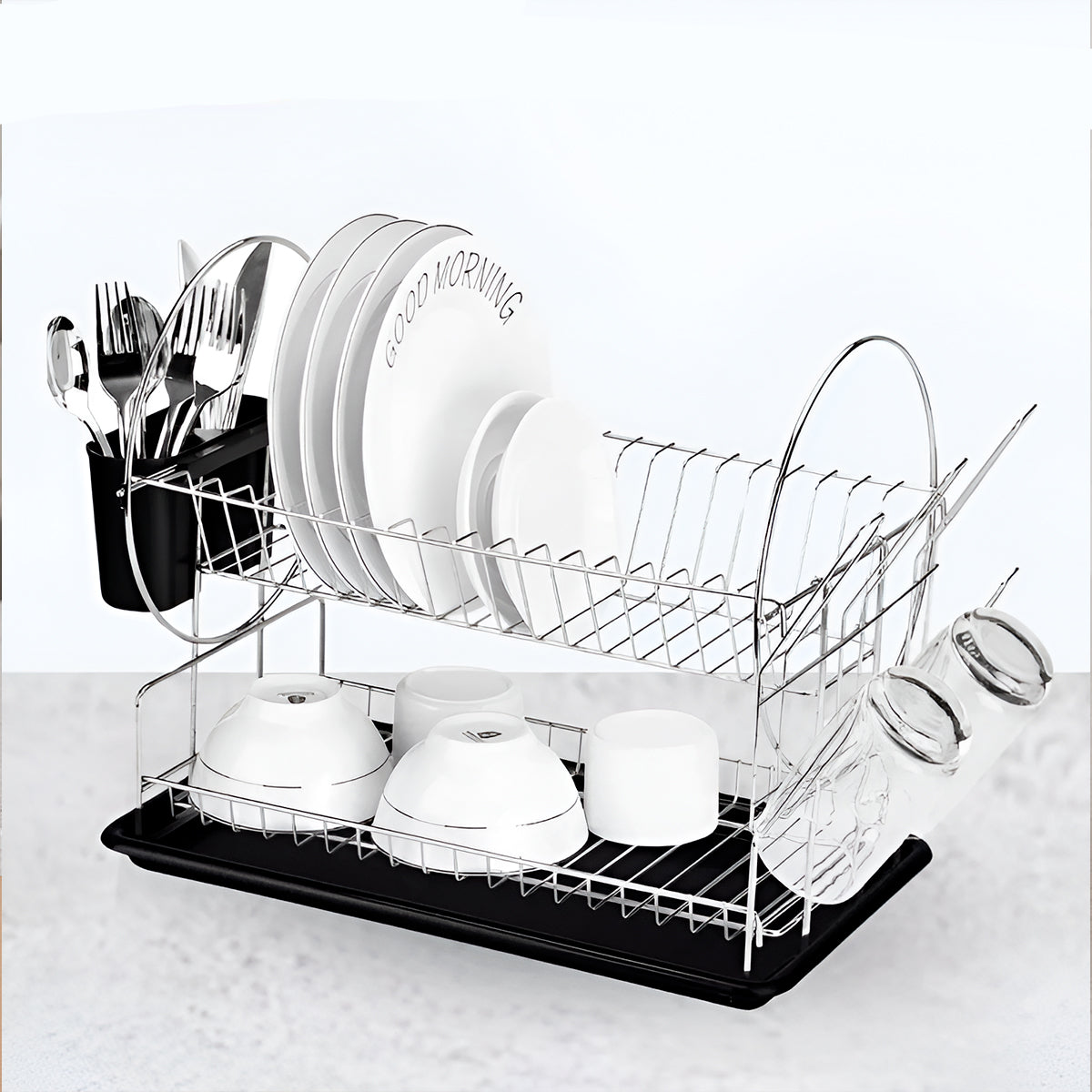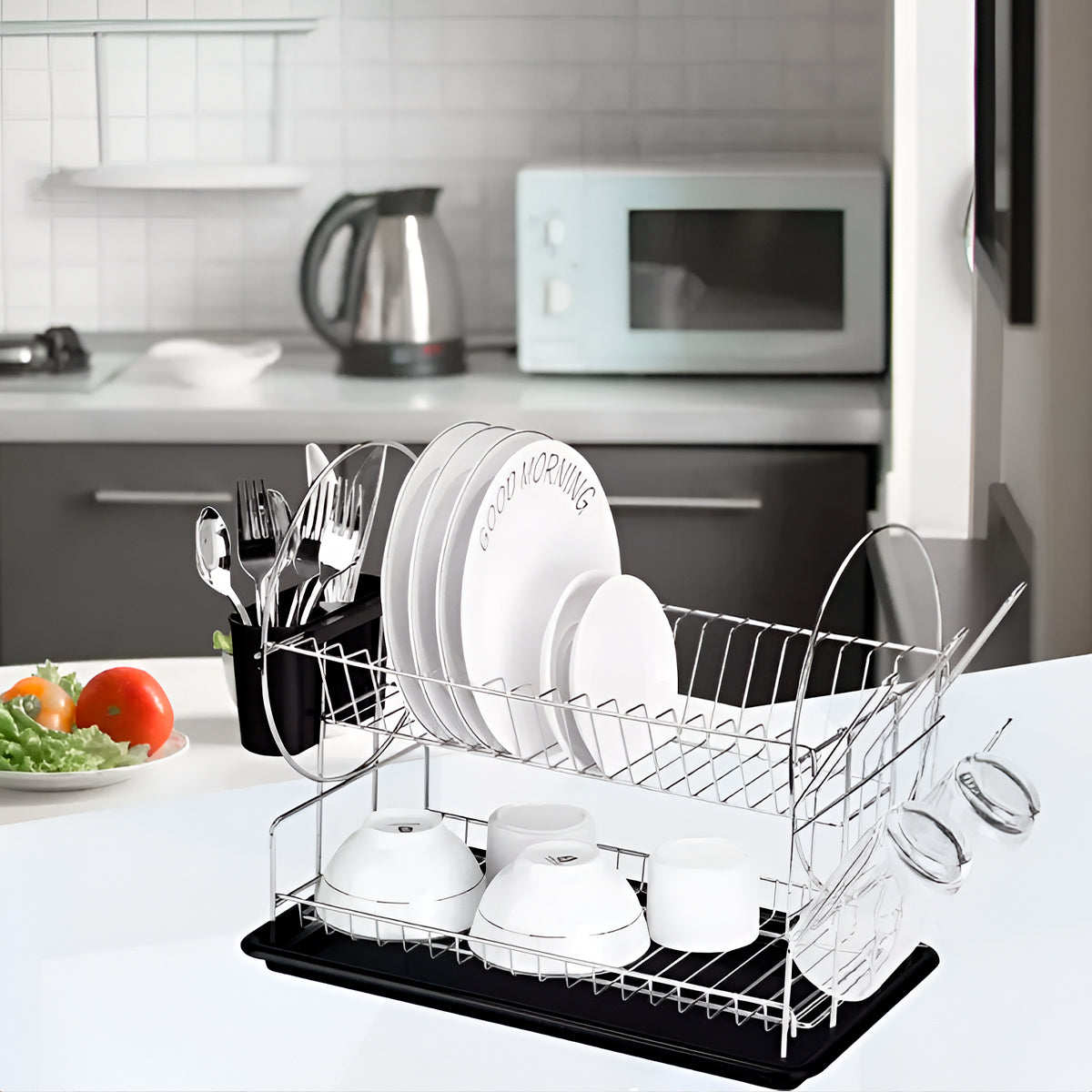 Este escurridor multiusos no solo sirve para secar platos, sino también para utensilios de cocina, vasos y otros productos, ofreciendo una solución versátil y funcional. Fabricado en acero inoxidable SUS 304 de calidad alimentaria, cuenta con gel de sílice antideslizante que garantiza resistencia al calor, durabilidad y protección contra la oxidación.