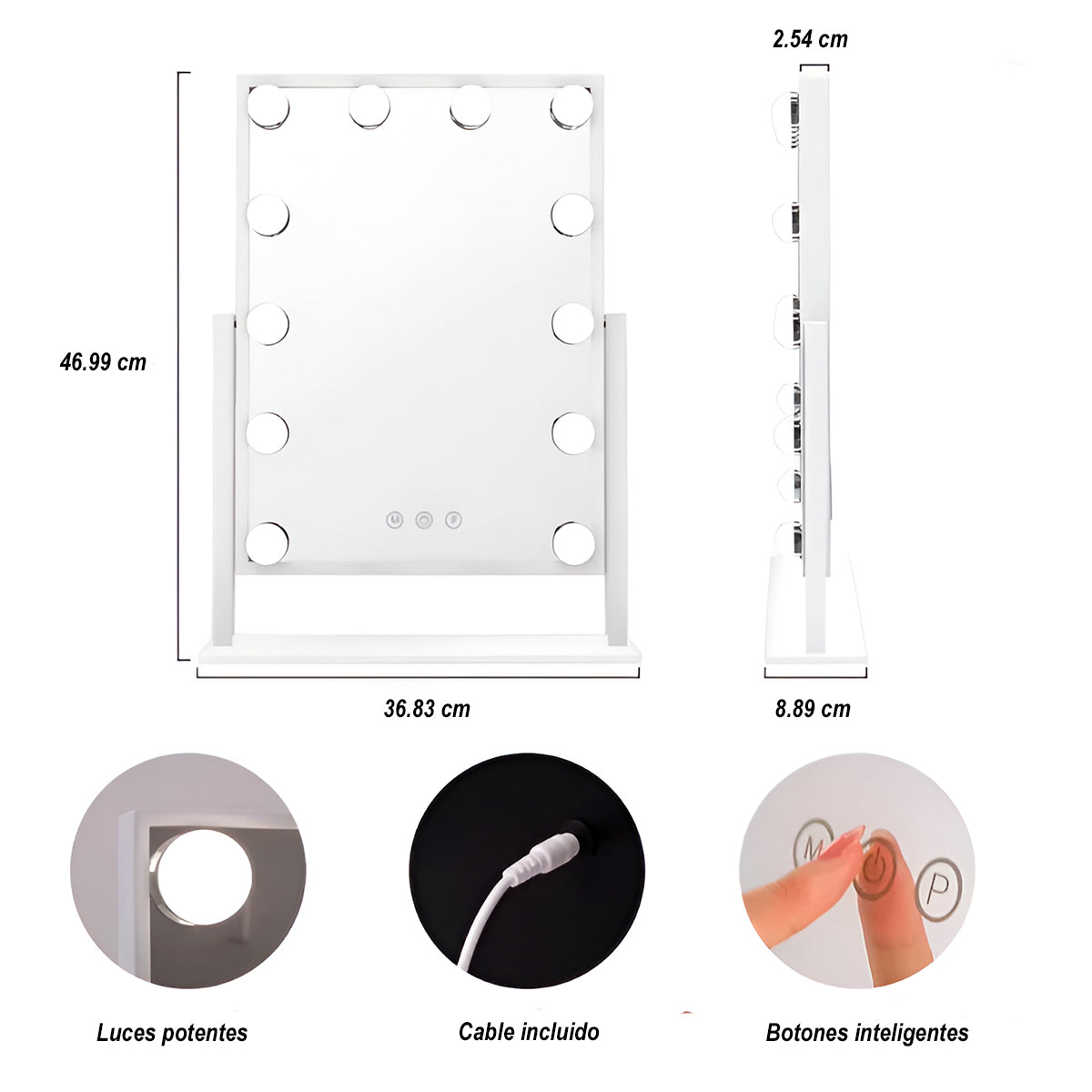 Este espejo ofrece una vista amplia y clara para cada detalle. Su estructura de aluminio y base metálica brindan una sensación de solidez y durabilidad, mientras que las bombillas LED de alta calidad prometen hasta 50,000 horas de uso sin necesidad de reemplazo. ¡Combina funcionalidad, elegancia y resistencia en un solo accesorio esencial para tu tocador!