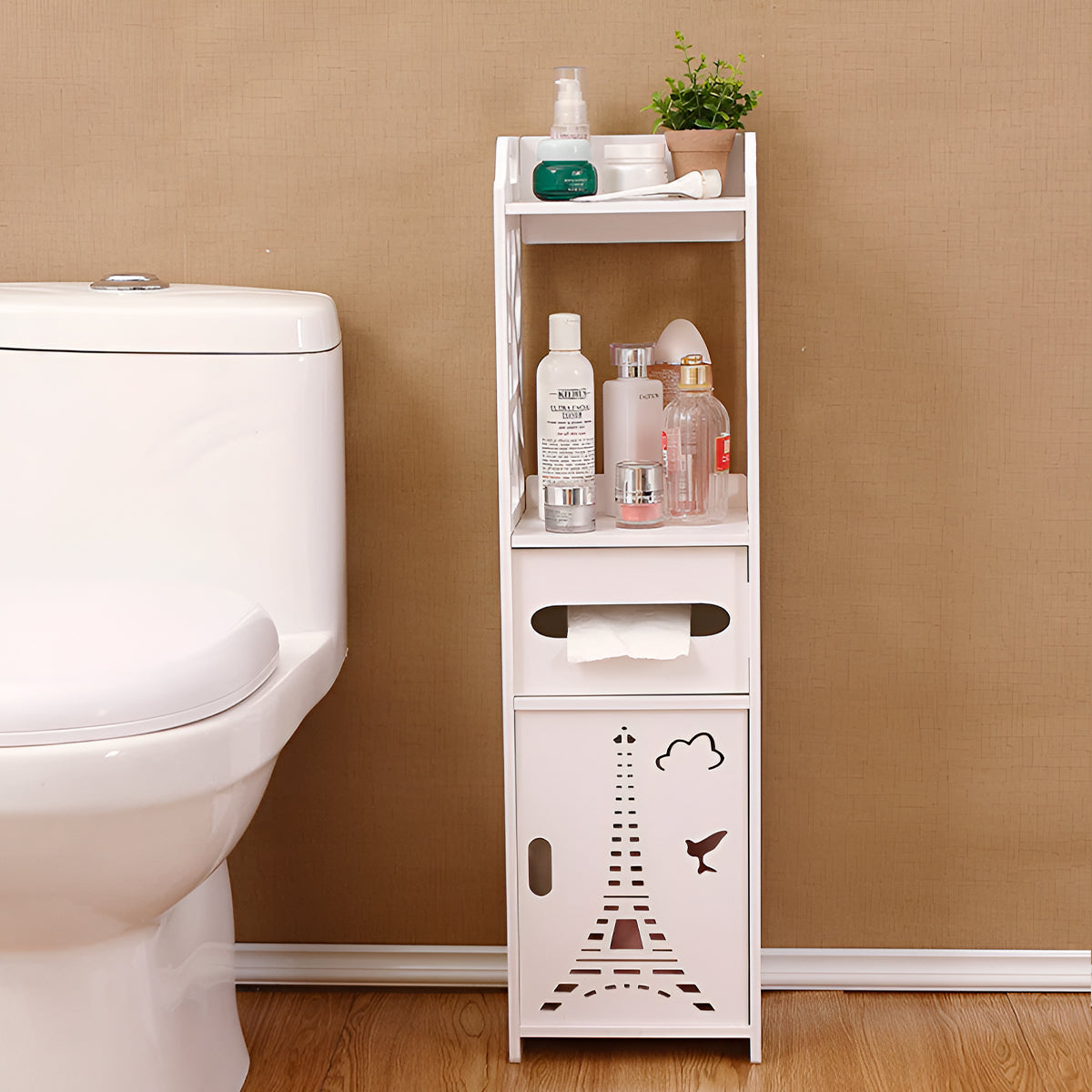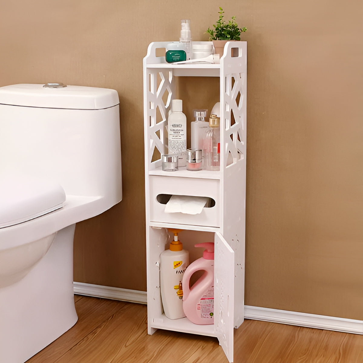 Está fabricado en MDF de alta calidad y cuenta con una puerta que protege su contenido del polvo y la humedad. Además, incorpora un práctico dispensador para papel, que ofrece una forma segura y elegante de acceder a él. Ideal para almacenar desde maquillaje y accesorios hasta papelería o especieros.